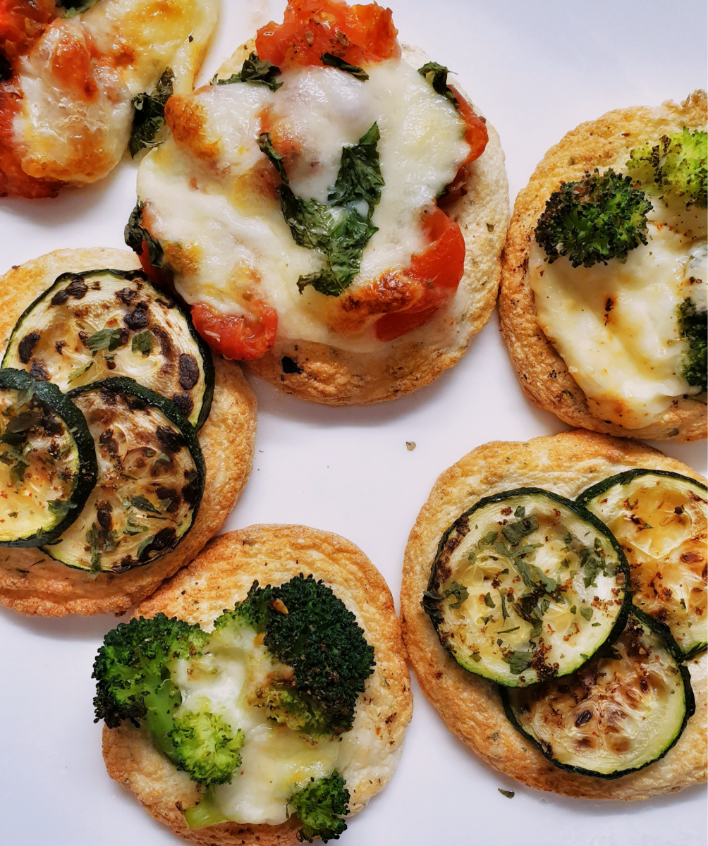 Z těsta vytvoříme placičky, které upečeme na pečícím papíře potřeným lžičkou oleje a dáme na 5 minutek zapéct, já jsem na střídačku přidala rajčata, brokolici, mozzarellu, kozí sýr a dala ještě pod gril zapéct.