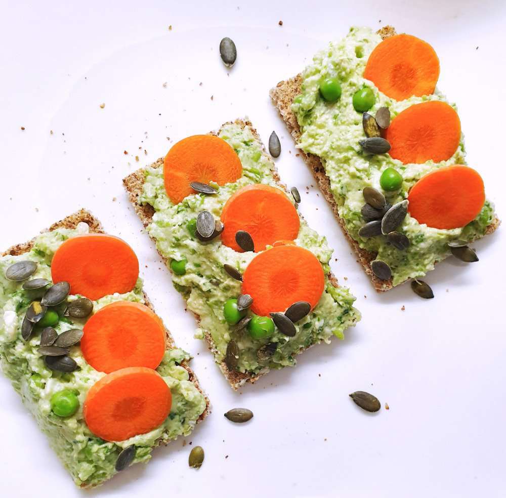 Naneseme na celozrnný knackebrot v mém případě Racio žitný s vlákninou, já jsem posypala ještě lžičkou dýňového semínka (balíček zdraví ) Nezapomeň zde využít slevu 10% kód Terezka11 Ozdobila jsem mrkví.